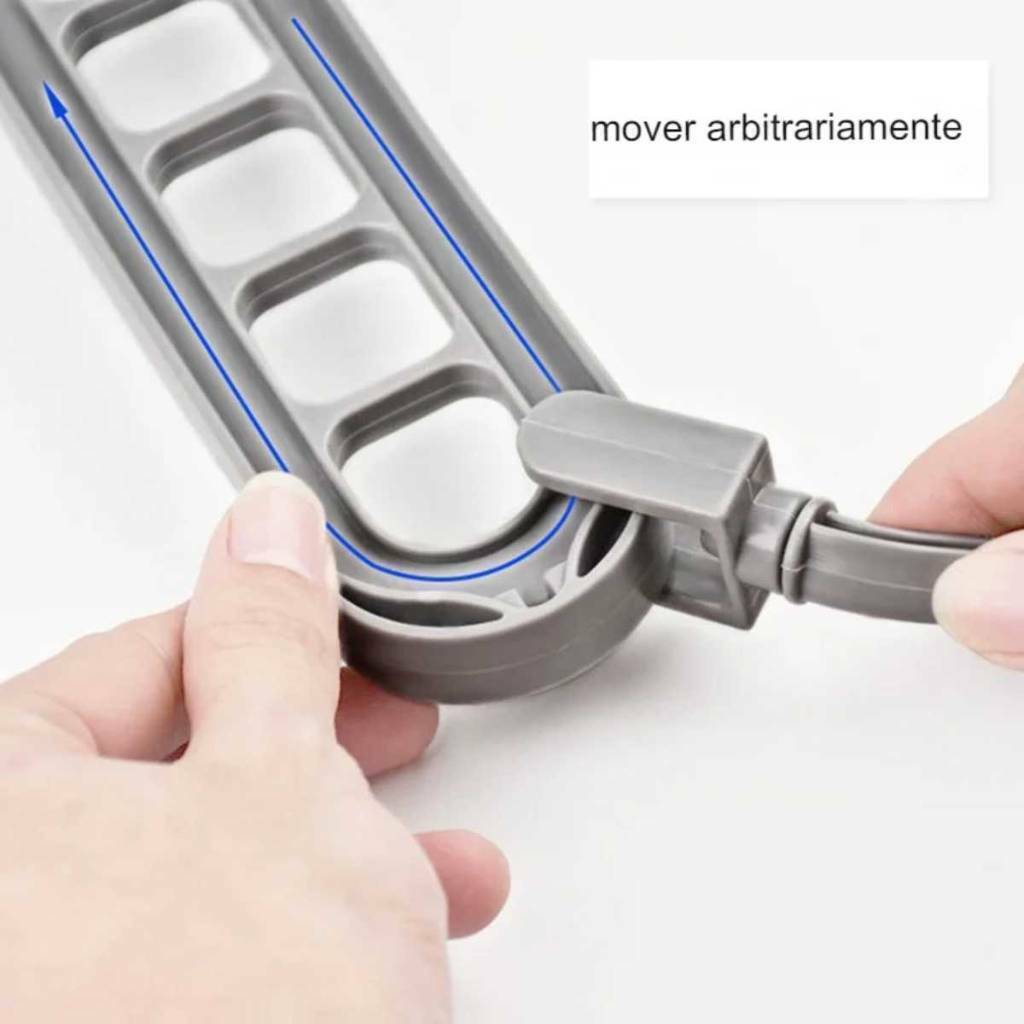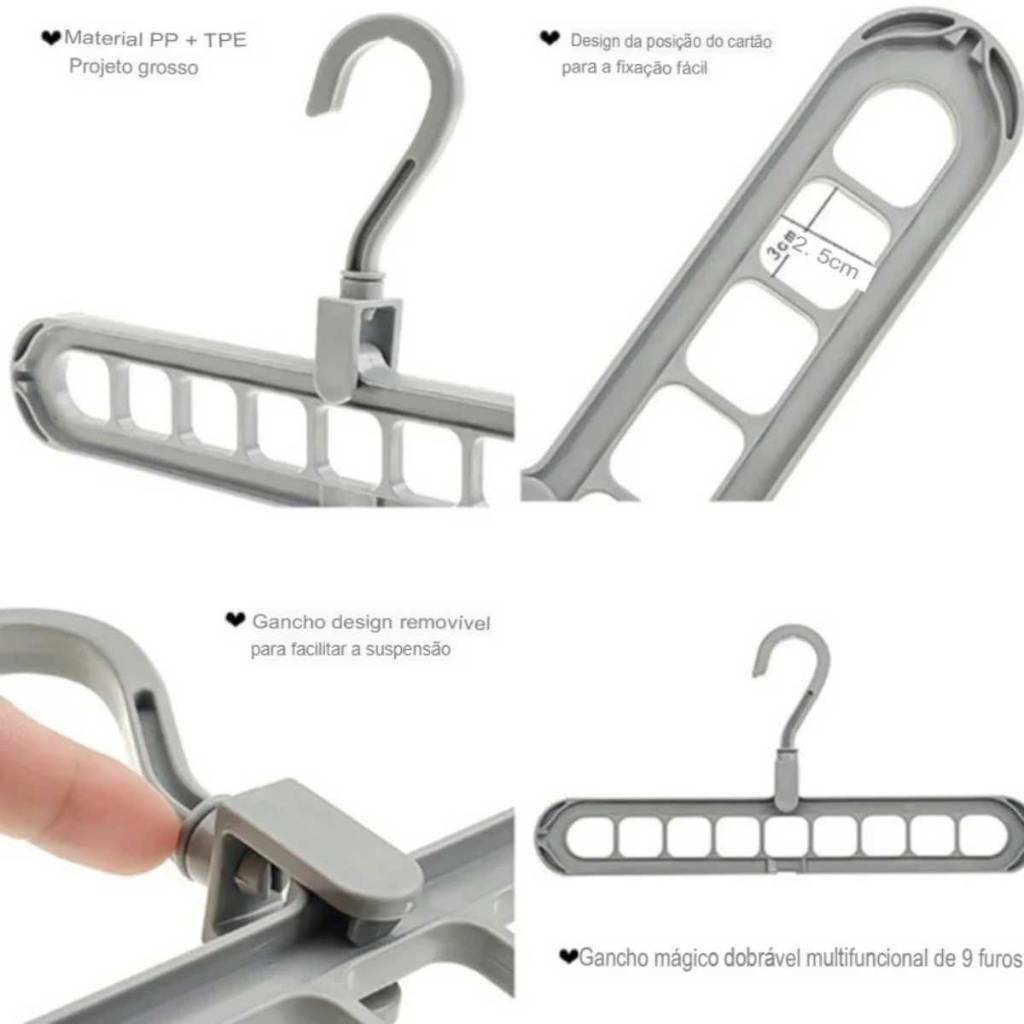 O suporte possui 9 furos, permitindo a organização de até 9 cabides comuns de forma vertical, otimizando espaço.